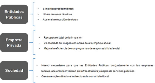 Una vez finalizada la ejecución o avance del proyecto, el Tesoro Público devuelve el monto invertido a la Empresa Privada mediante Certificados que podrán ser utilizados para el pago del impuesto a la renta. Posteriormente, las entidades públicas devuelven al Tesoro Público, el monto financiado para la ejecución de sus proyectos.
